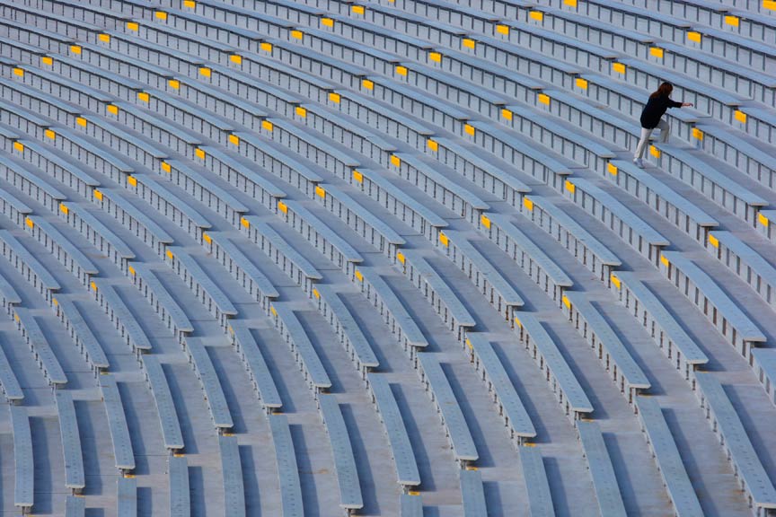 A stadium worker makes her way through the stands a couple hours before kickoff