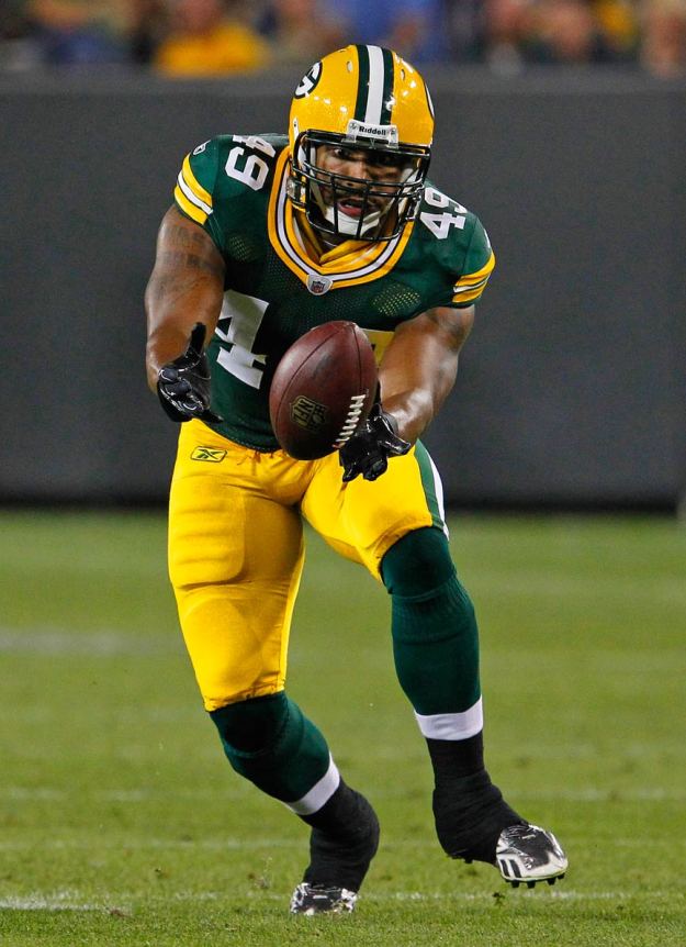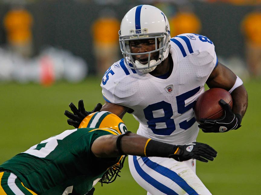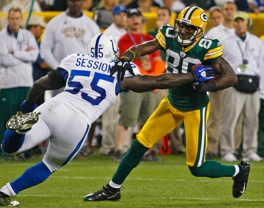 Donald Driver breaks the tackle of Colt’s Clint Session.