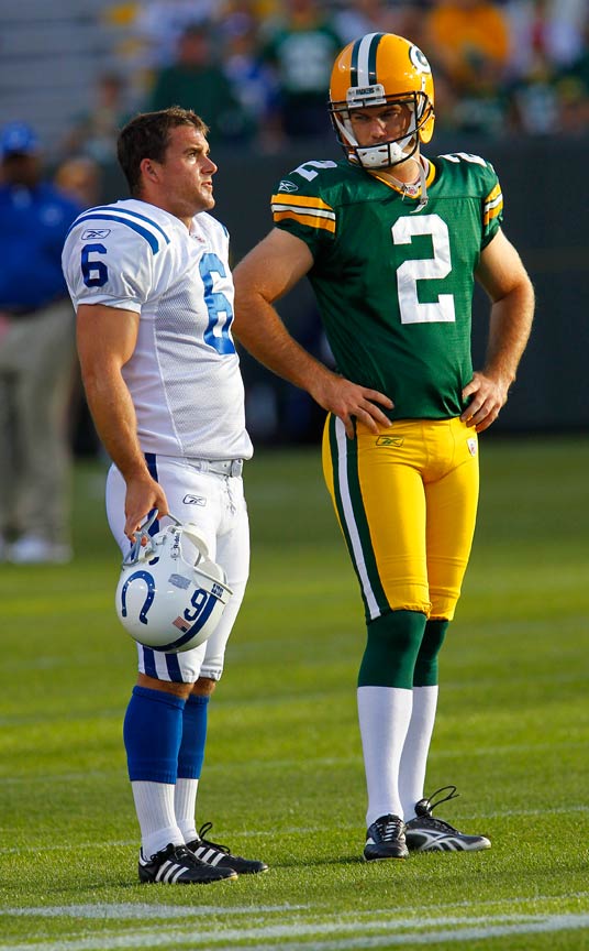 Packer’s kicker Mason Crosby talks with Colts kicker Garrett Lindholm