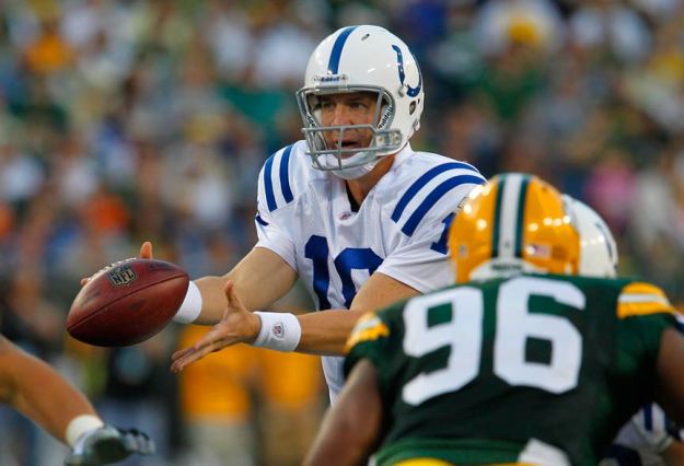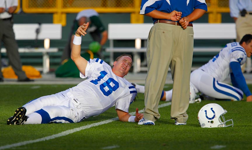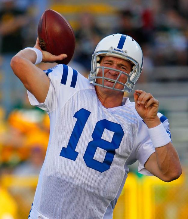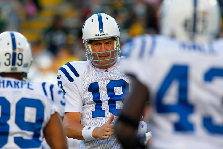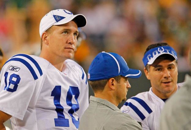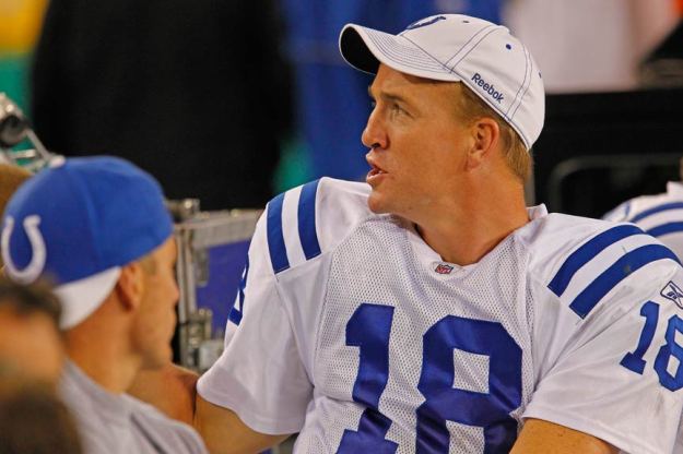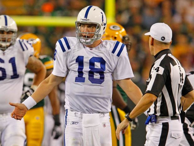 Peyton Manning talks with one of the Colts coaches prior to the game.