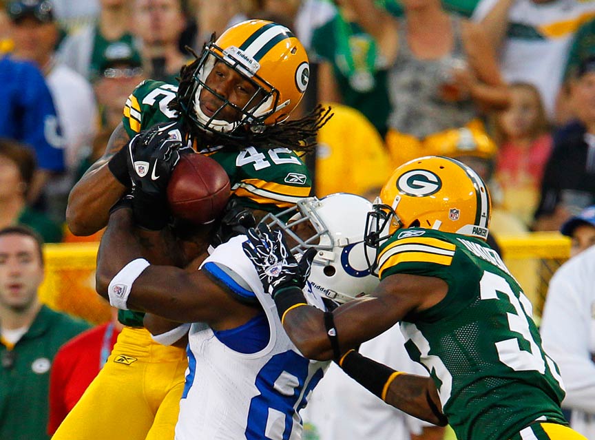 The Packer’s MorganBurnett and Brandon Underwood break up a Colt’s pass play.