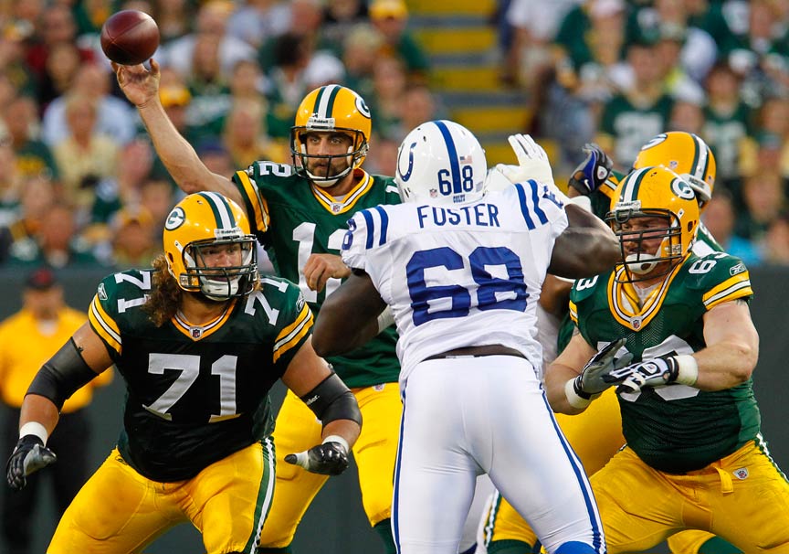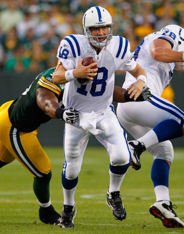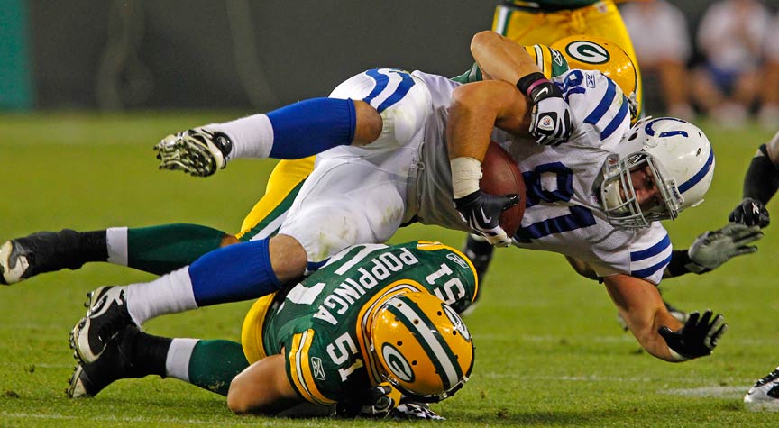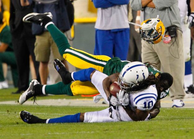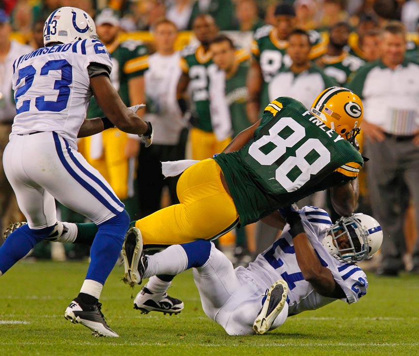 Packer’s Jermichael Finley runs over the Colt’s Jacob Lacey.