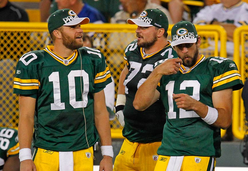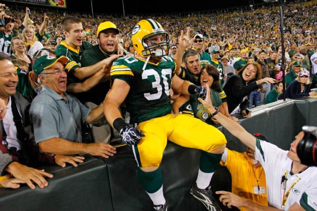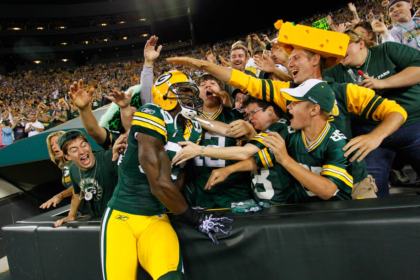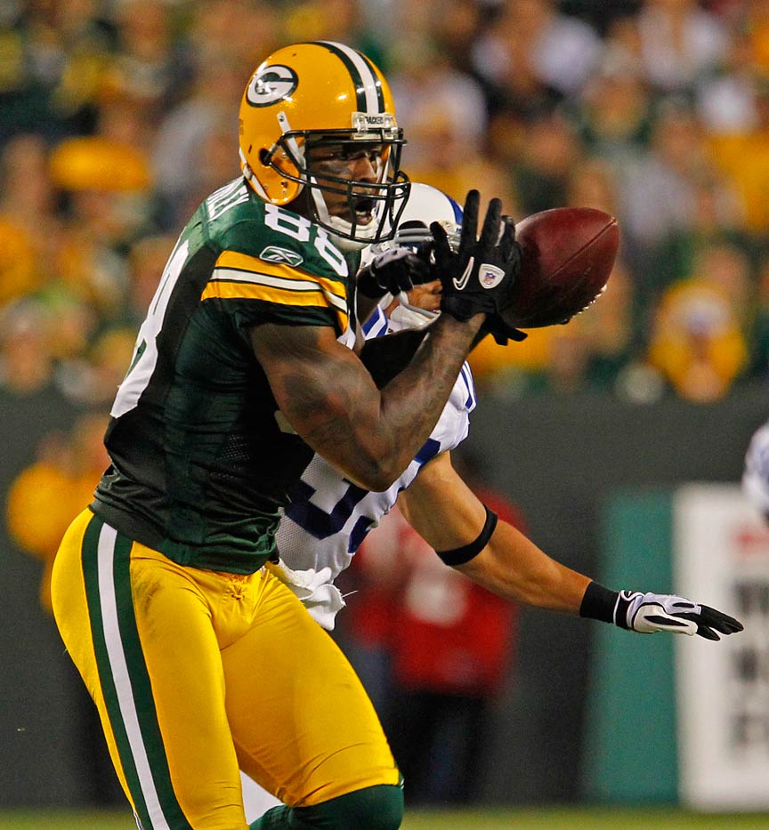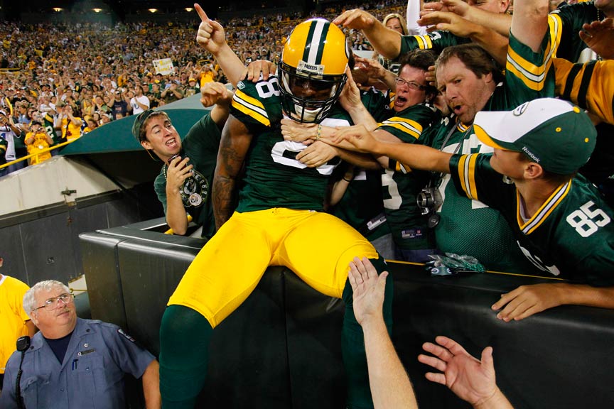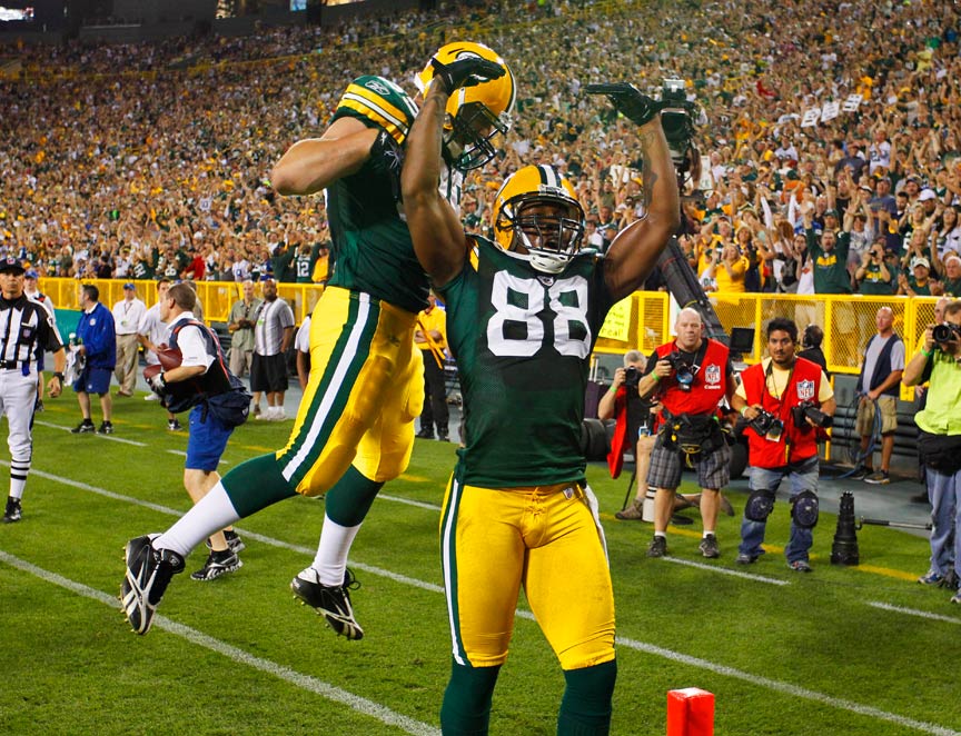 Korey Hall and Jermichael Finley celebrate a touchdown.