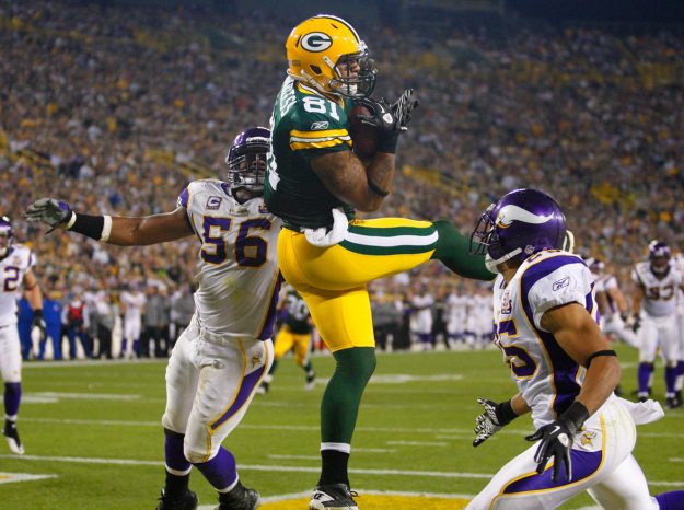 Green Bay Packers tight end Andrew Quarless scores a touchdown against Minnesota Vikings linebacker E.J. Henderson and Tyrell Johnson.