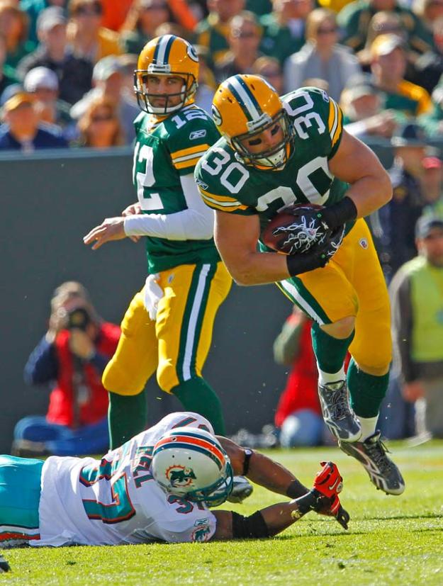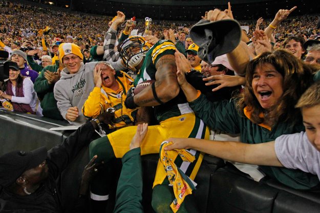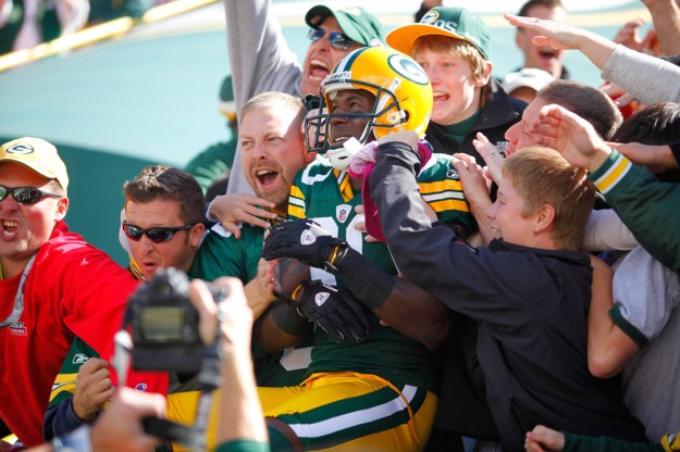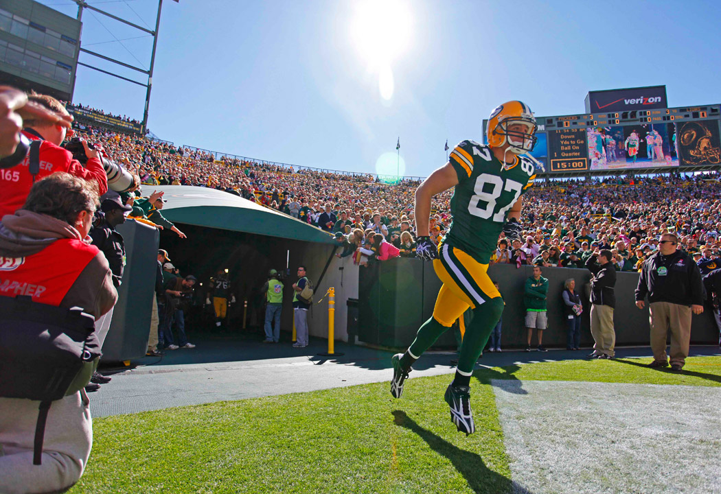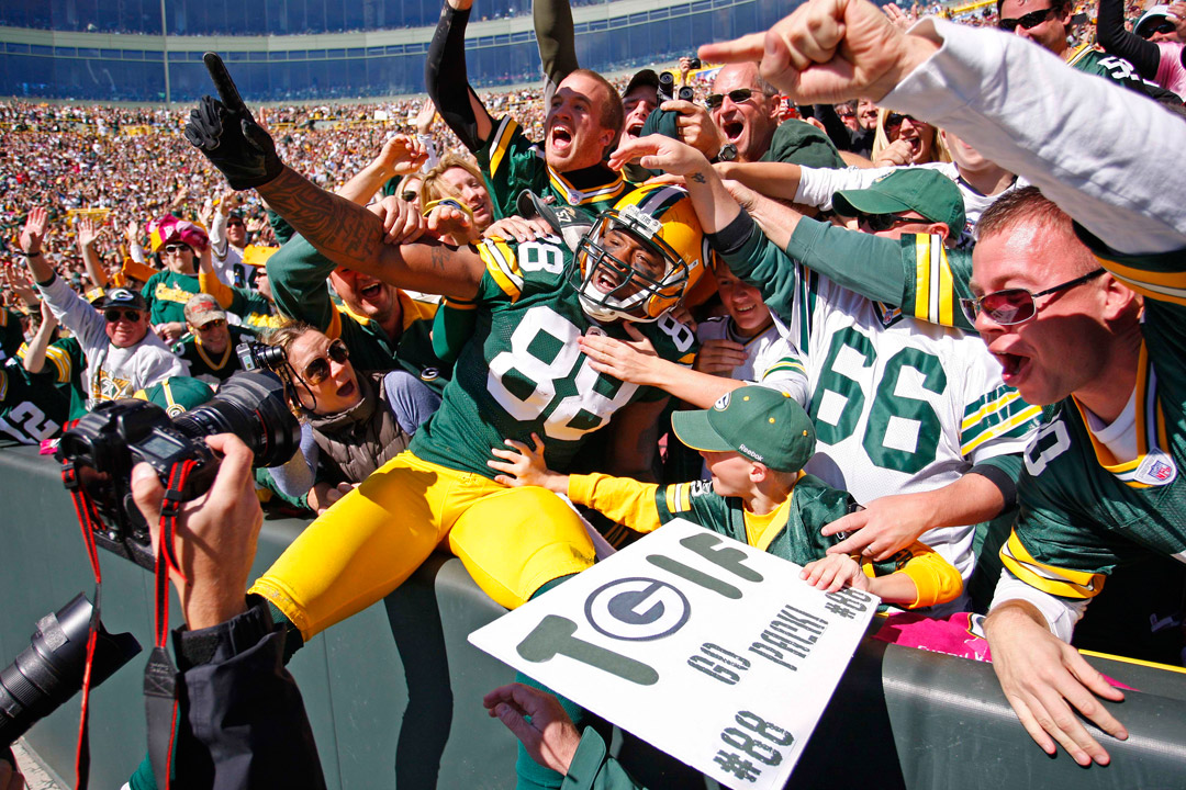 Green Bay Packers tight end Andrew Quarless celebrates a touchdown with a Lambeau Leap.
