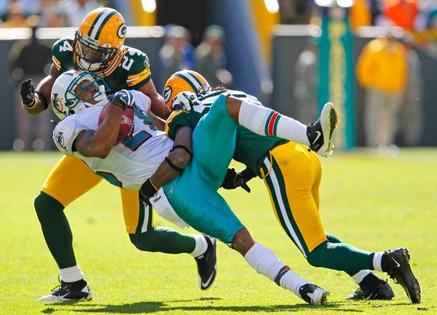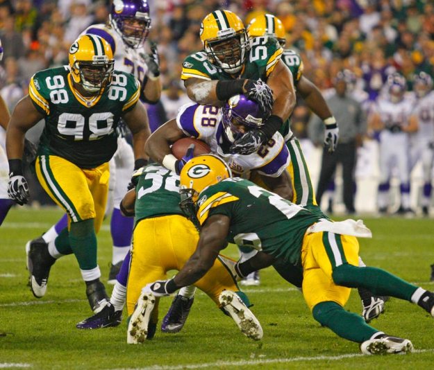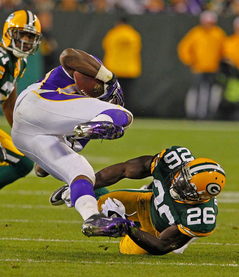 Minnesota Vikings running back Adrian Peterson is hit by Green Bay Packers linebacker Desmond Bishop (55), cornerback Tramon Williams (38) and safety Charlie Peprah(26).