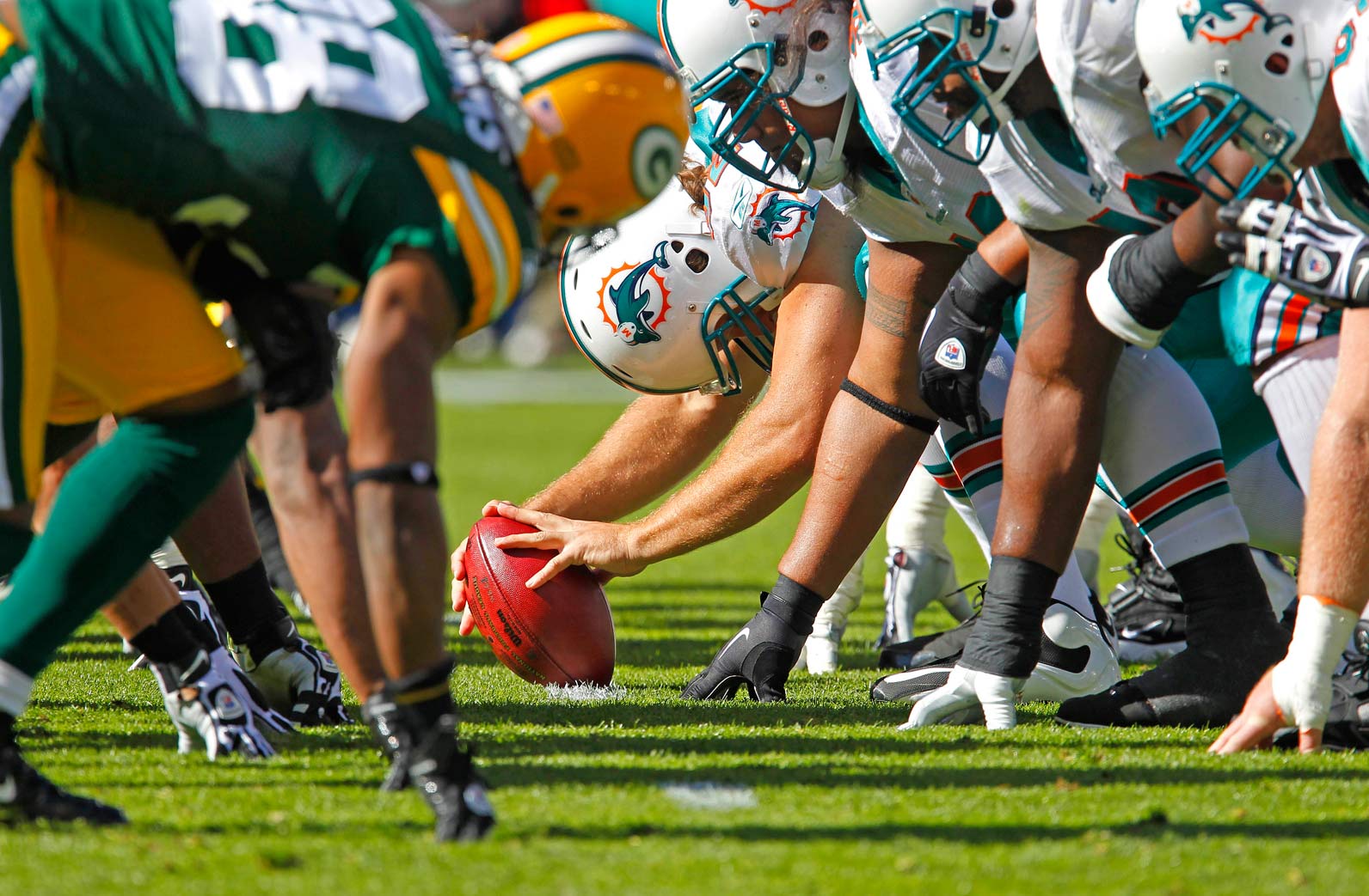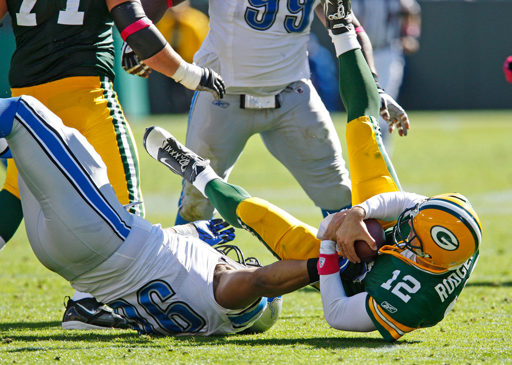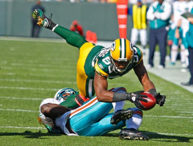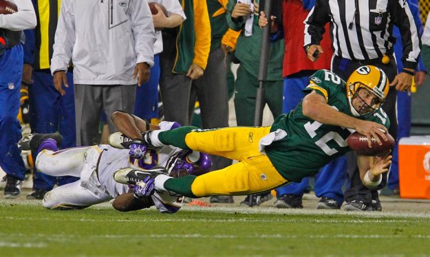 Green Bay Packers quarterback Aaron Rodgers dives for extra yards while being wrapped up by Minnesota Vikings cornerback Antoine Winfield.