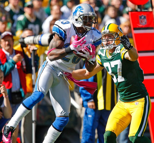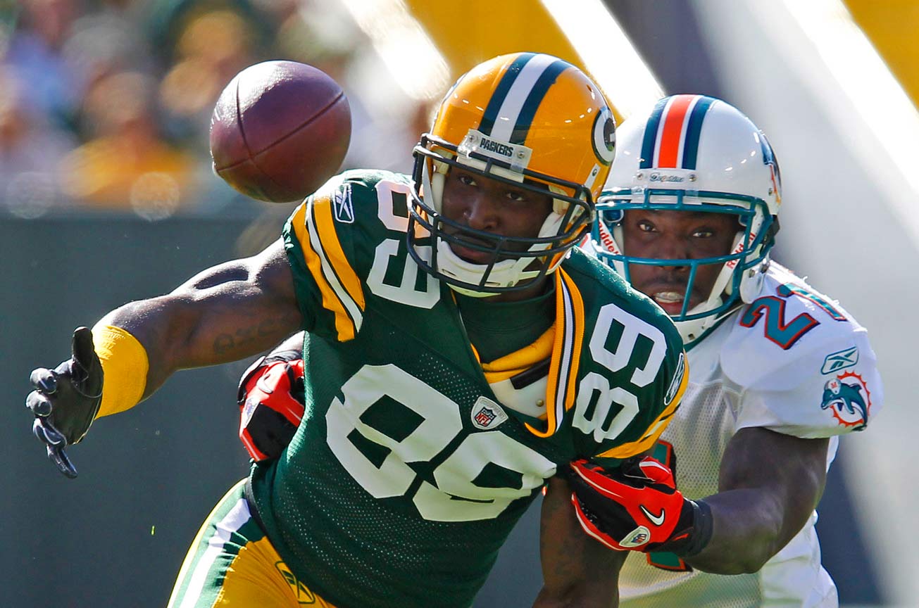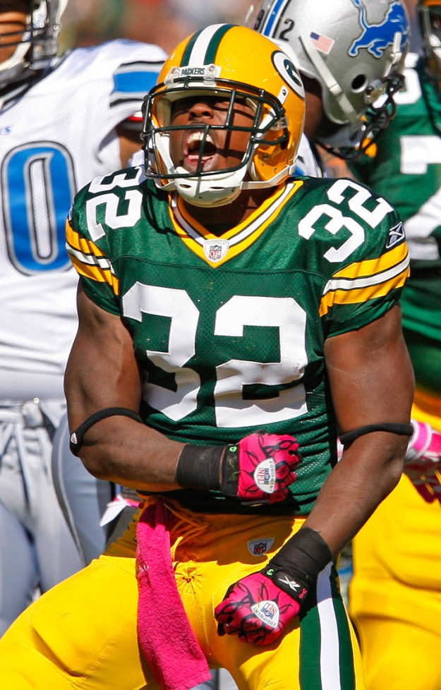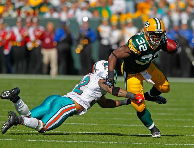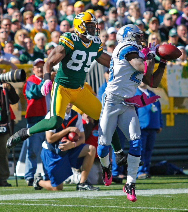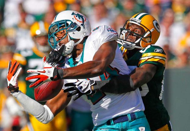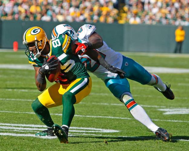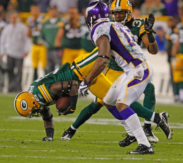 Green Bay Packers safety Nick Collins intercepts a ball intended for Minnesota Vikings wide receiver Percy Harvin.