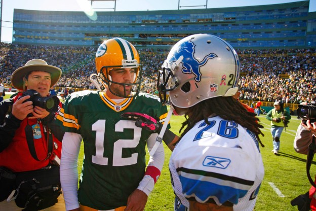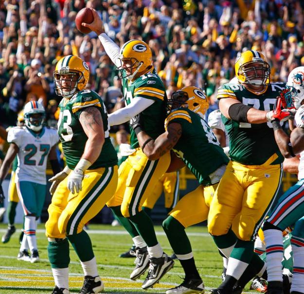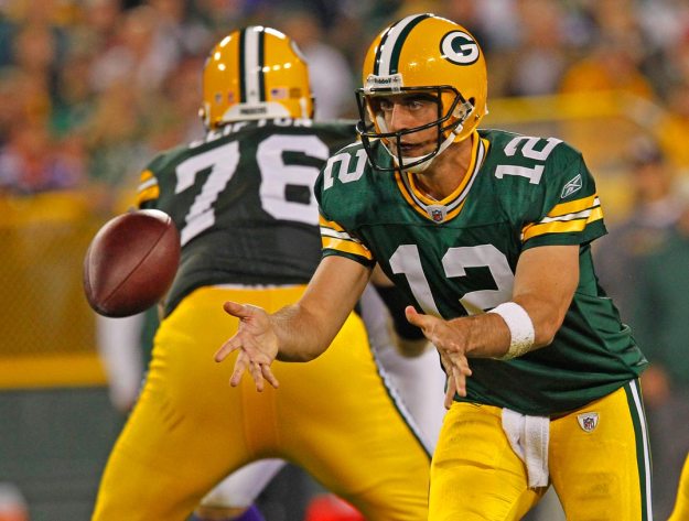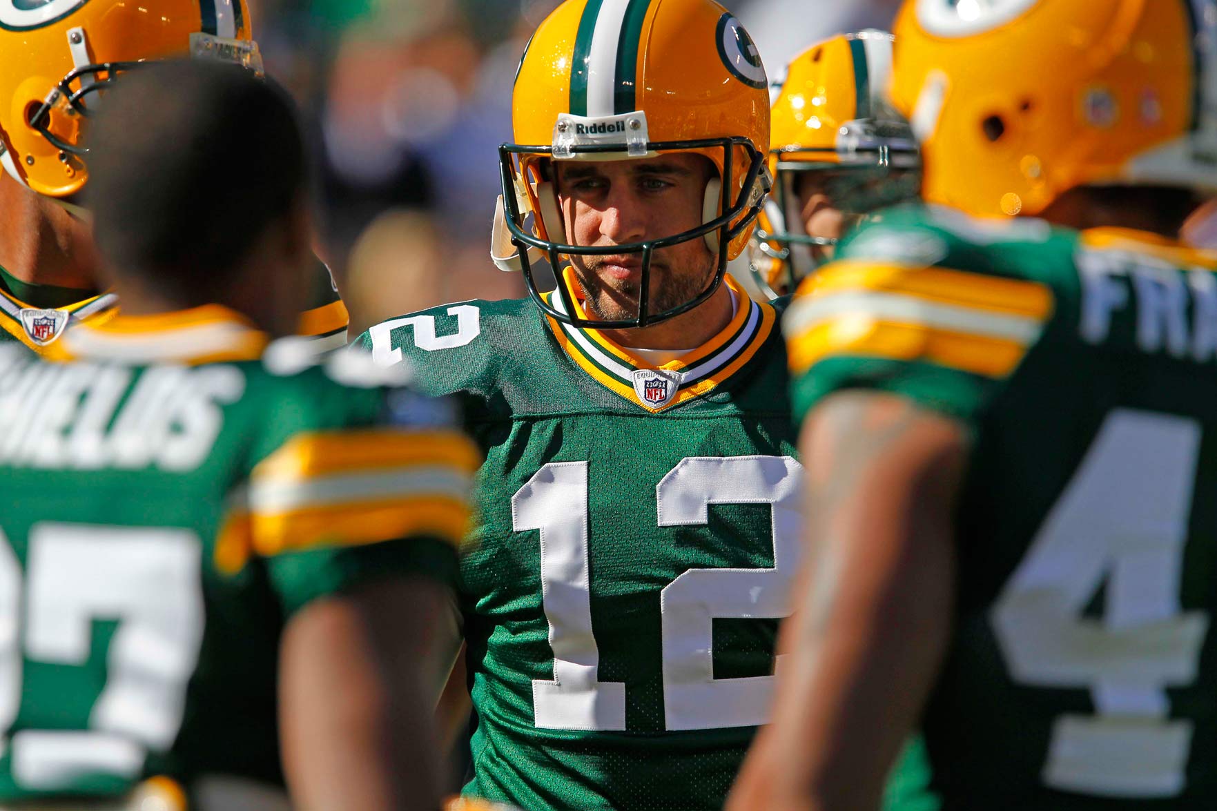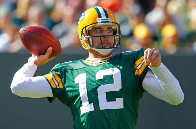 Green Bay Packers quarterback Aaron Rodgers pitches the ball.