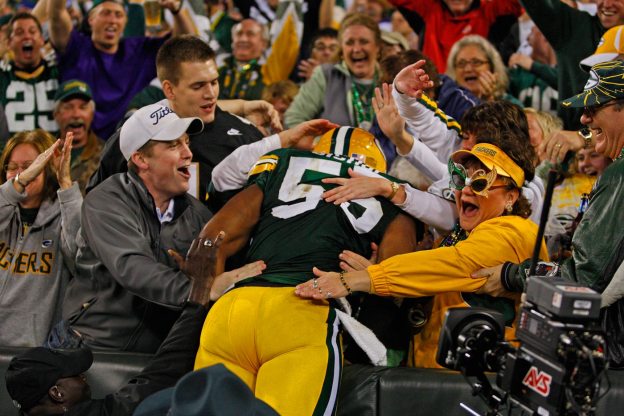 Green Bay Packers linebacker Desmond Bishop performs a Lambeau Leap after scoring a touchdown against the Minnesota Vikings.