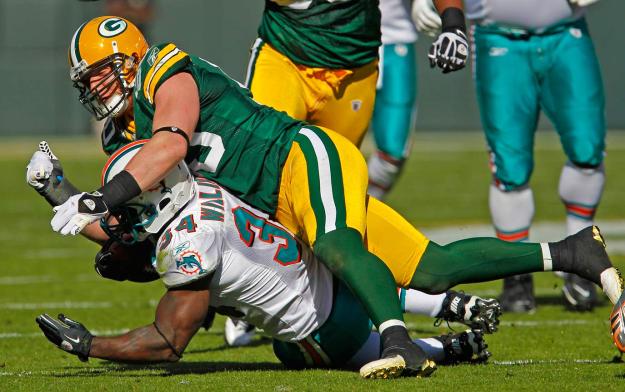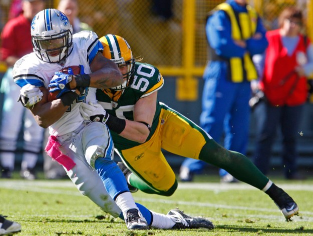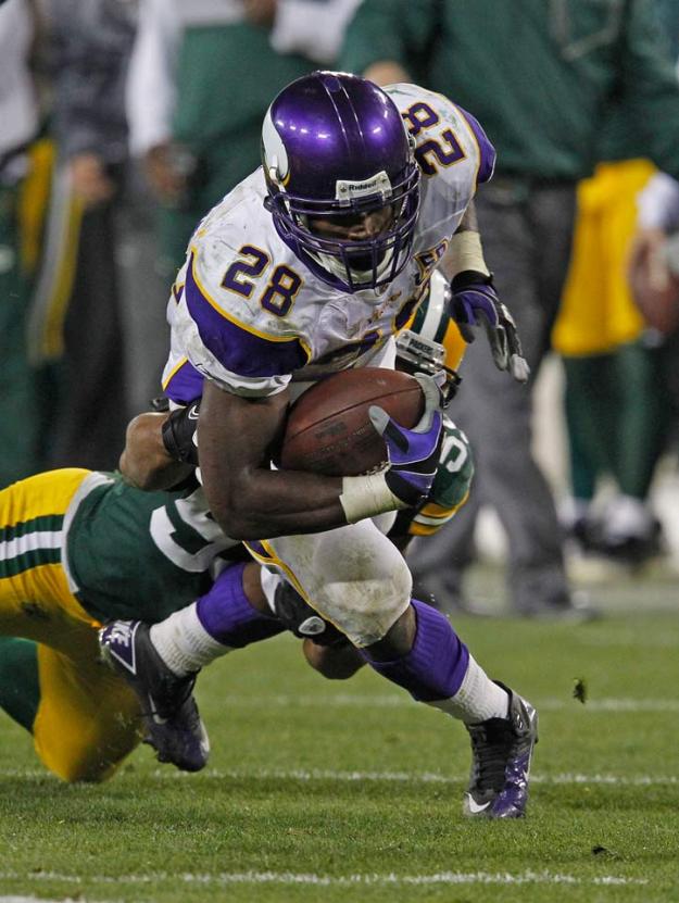 Minnesota Vikings running back Adrian Peterson is hit by Green Bay Packers linebacker Brad Jones.