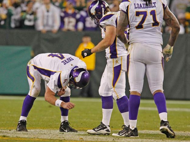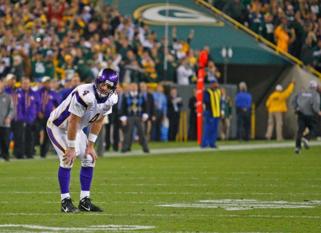 Minnesota Vikings quarterback Brett Favre reacts after failing to score in the last seconds against the Green Bay Packers.