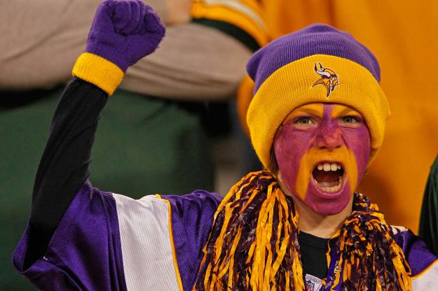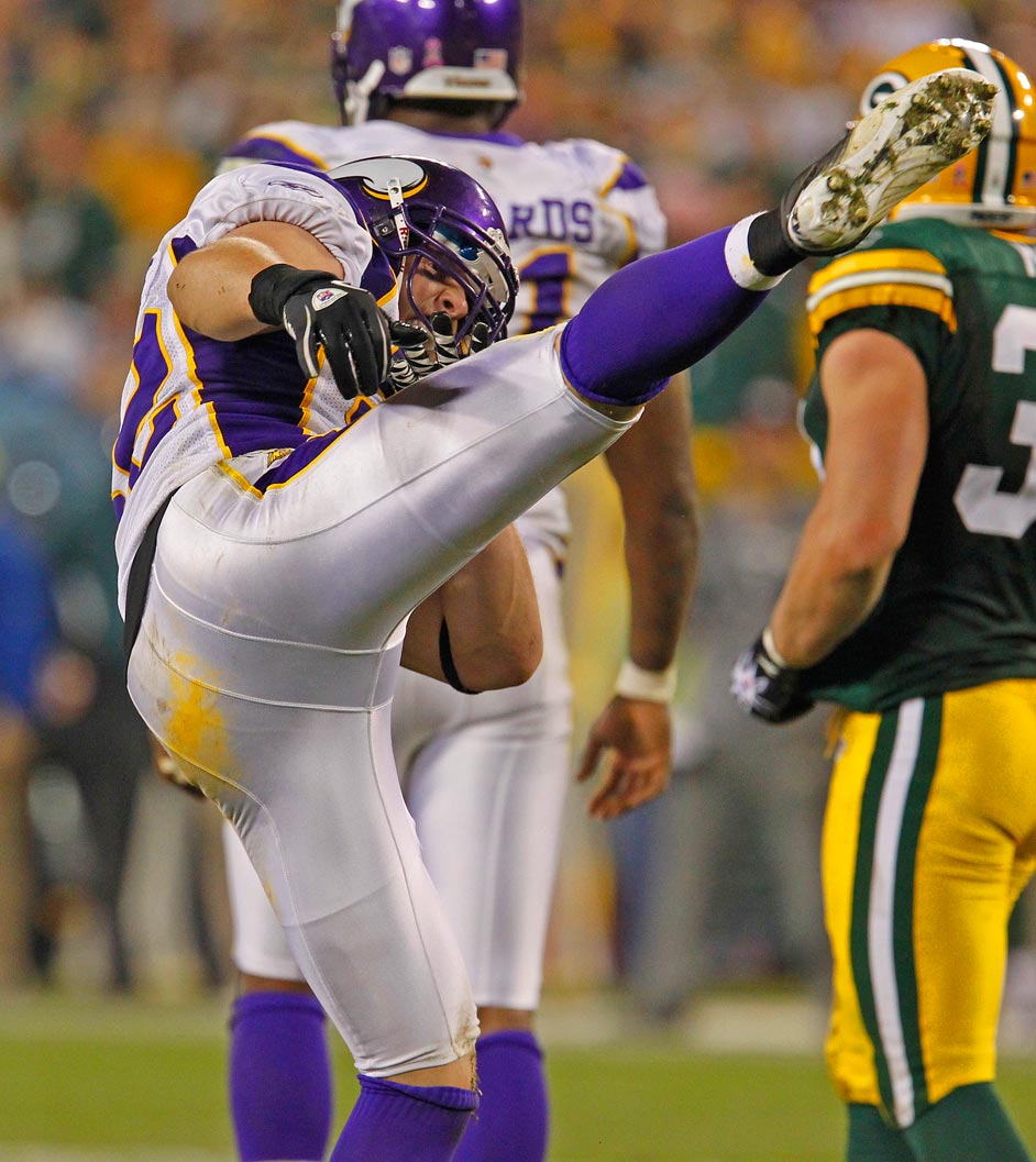 Minnesota Vikings linebacker Chad Greenway kicks the air after making a play against the Green Bay Packers.
