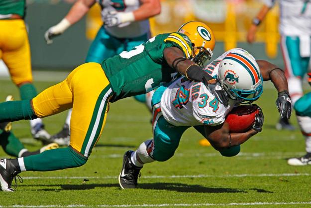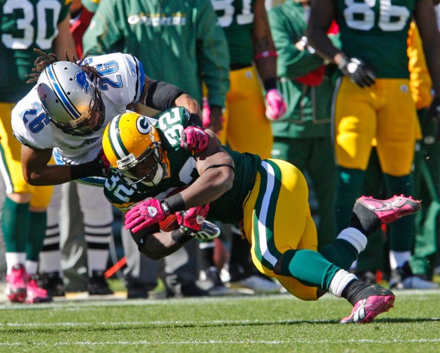 Green Bay Packers safety Charlie Peprah trips up Minnesota Vikings running back Adrian Peterson.