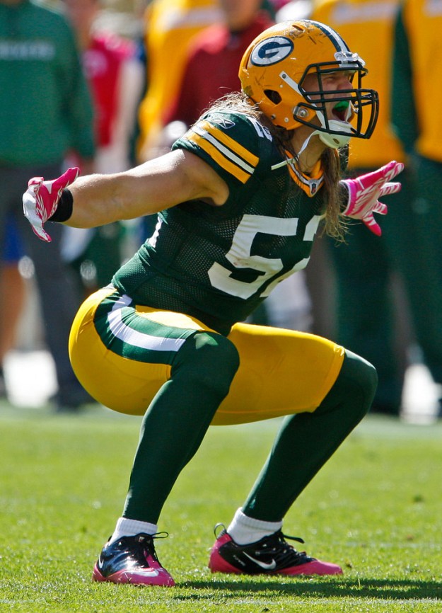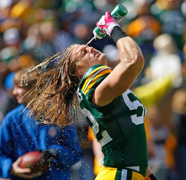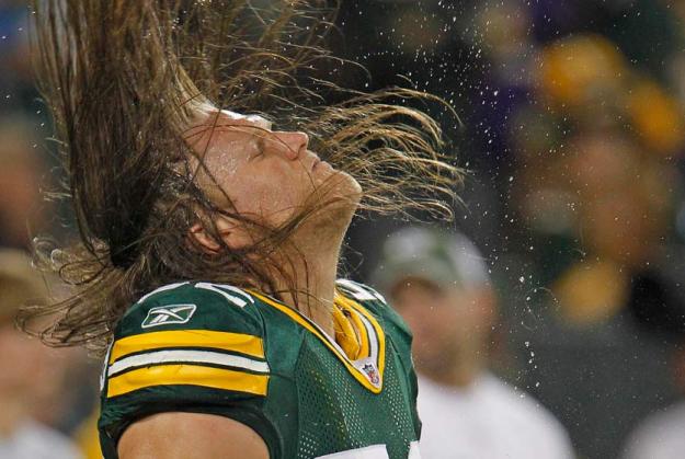 Green Bay Packers linebacker Clay Matthews tosses his hair back during warmups.