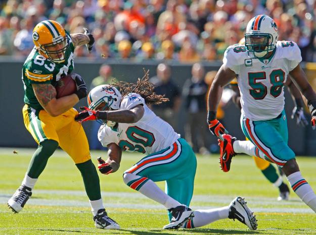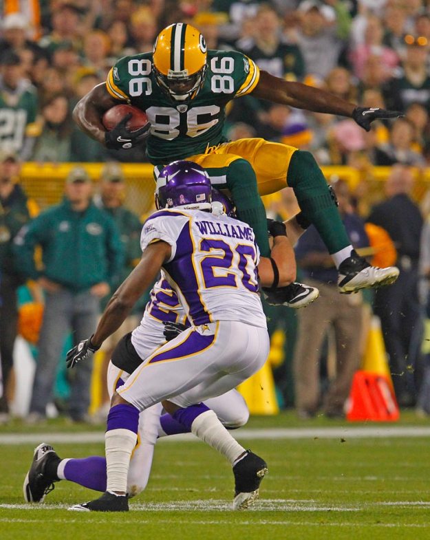 Green Bay Packers tight end Donald Lee leaps over Minnesota Vikings defenders Madieu Williams and Chad Greenway.
