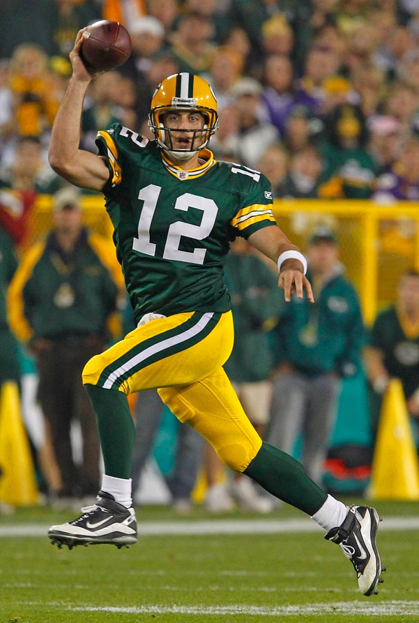 Green Bay Packers quarterback Aaron Rodgers scrambles with the ball.
