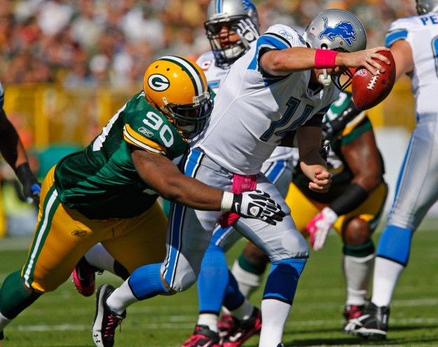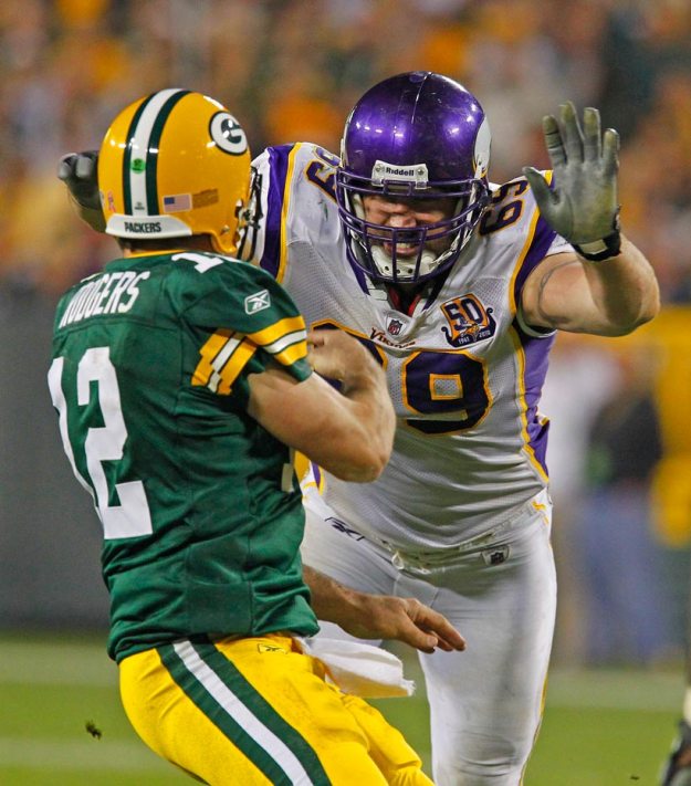 Minnesota Vikings defensive end Jared Allen pursues Green Bay Packers quarterback Aaron Rodgers.