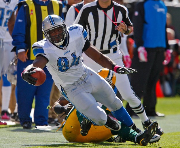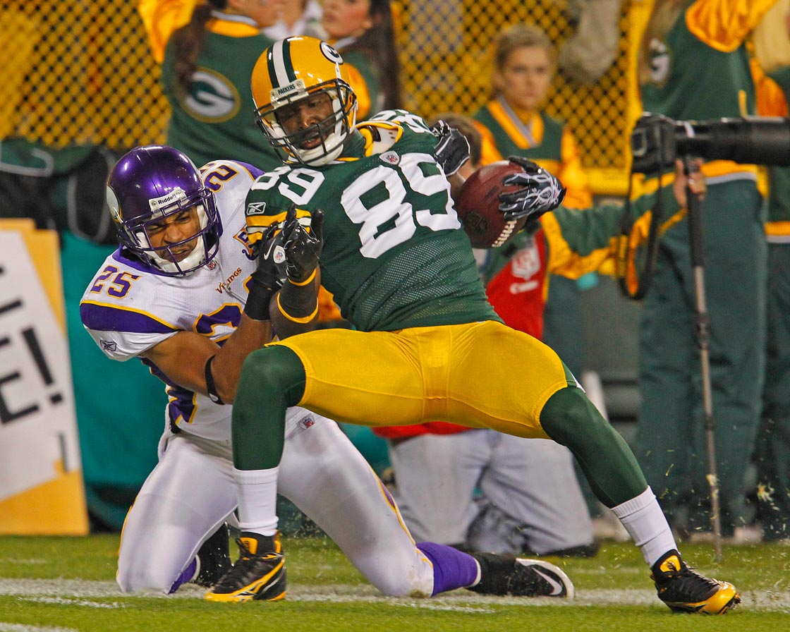 Green Bay Packers wide receiver James Jones is pulled to the ground by Minnesota Vikings safety Tyrell Johnson.