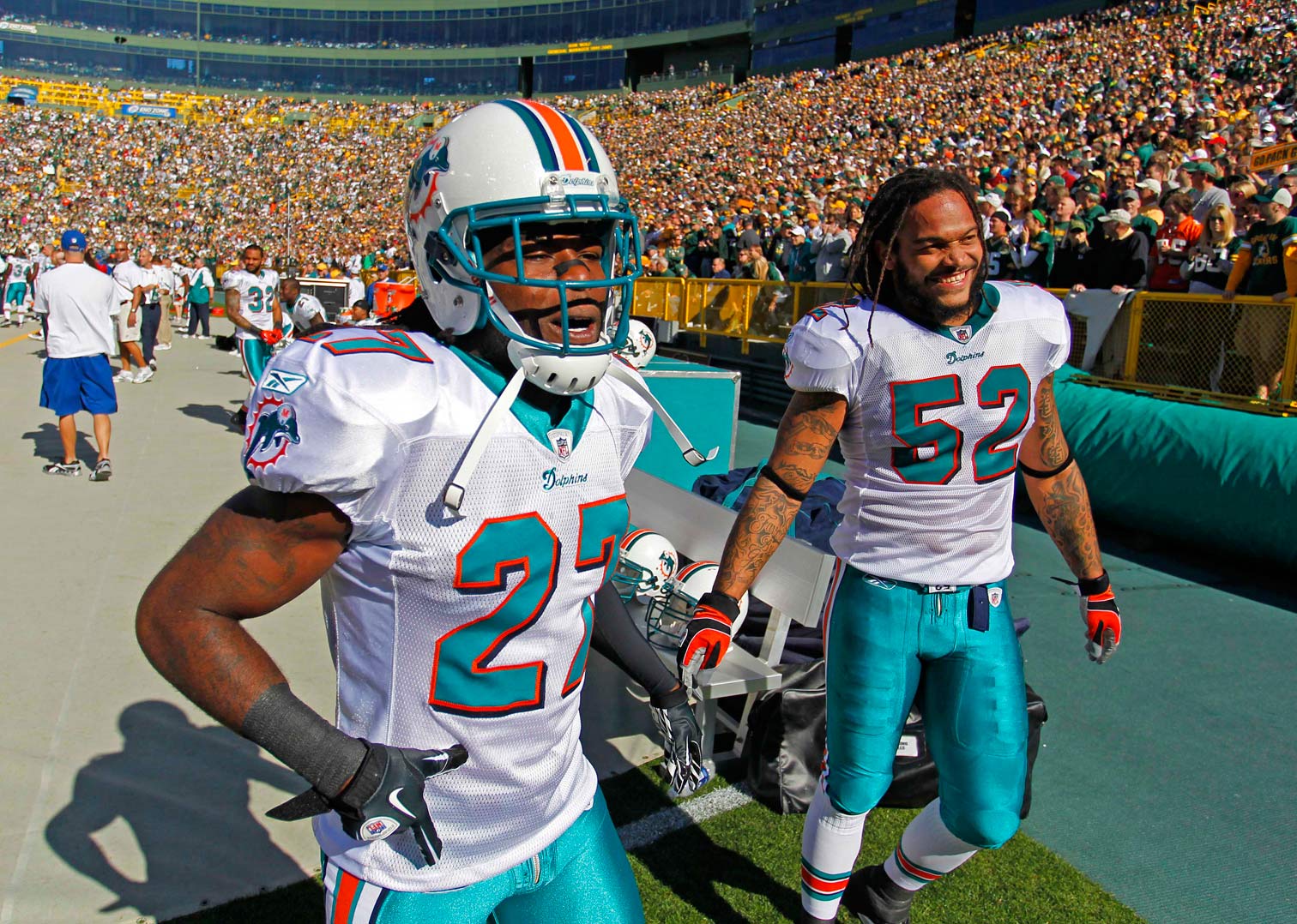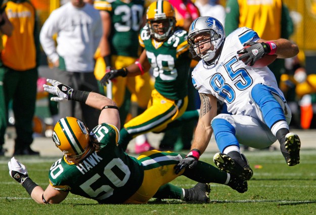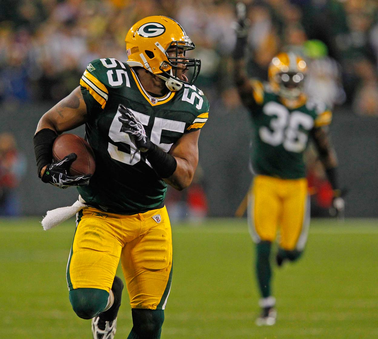 Green Bay Packers linebacker Desmond Bishop runs an interception back for a touchdown.