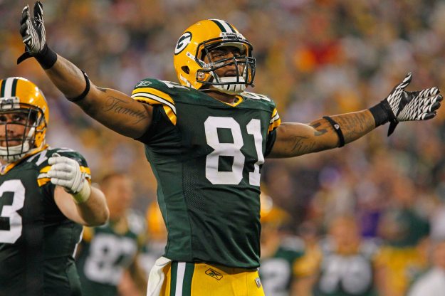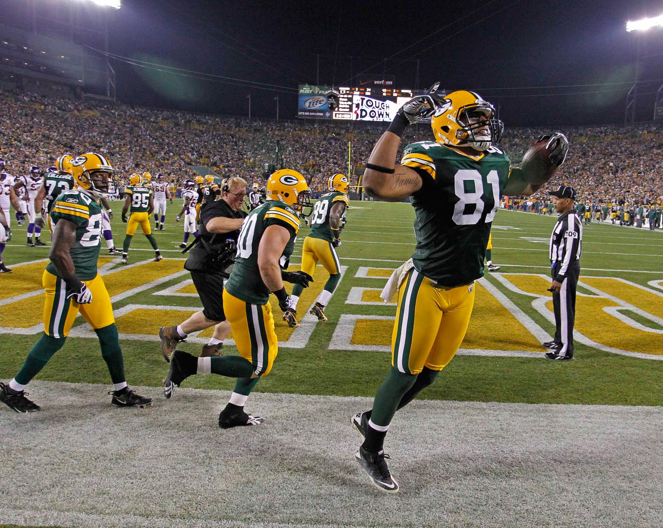 Green Bay Packers tight end Andrew Quarless raises his arms in celebration after the Green Bay Packers defeated the Minnesota Vikings.