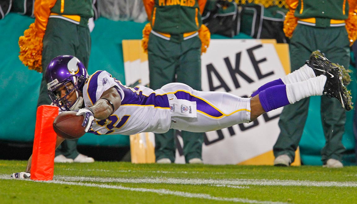 Minnesota Vikings wide receiver Percy Harvin dives for the pylon.
