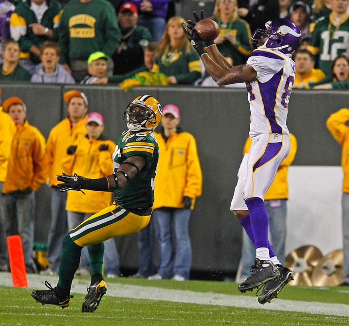 Minnesota Vikings wide receiver Randy Moss makes a catch while being covered by Green Bay Packers safety Nick Collins.