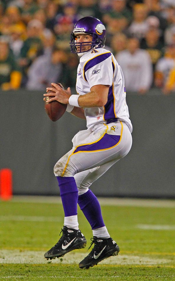 Minnesota Vikings quarterback Brett Favre looks to pass against the Green Bay Packers.