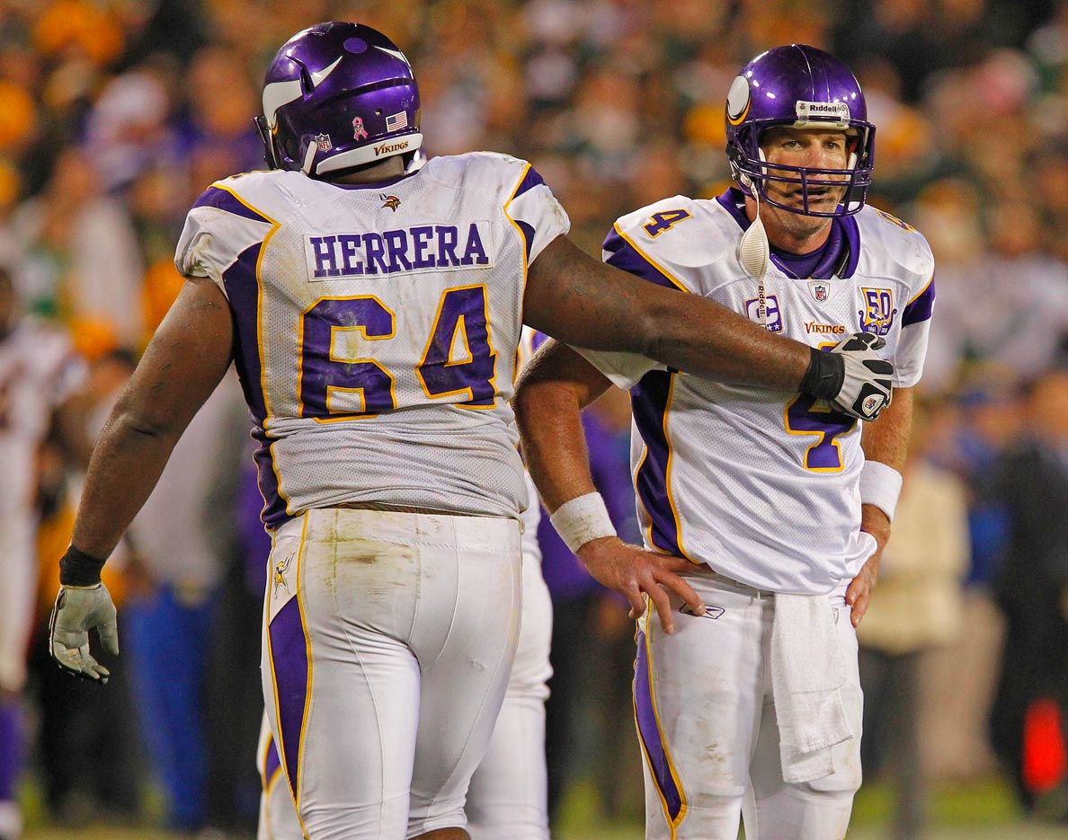 Minnesota Vikings guard Anthony Herrera consoles teammate Brett Favre after the final drive against the Green Bay Packers.