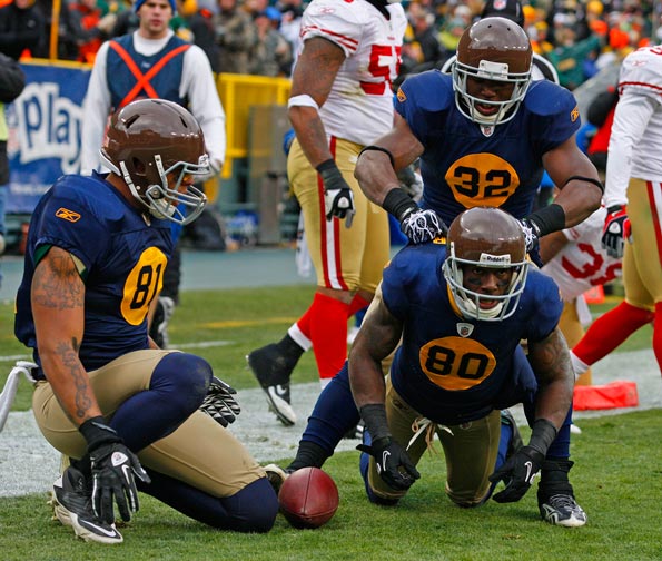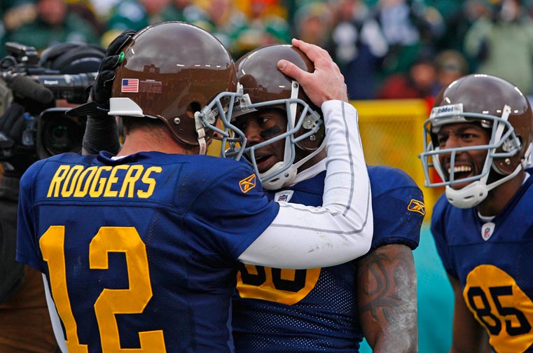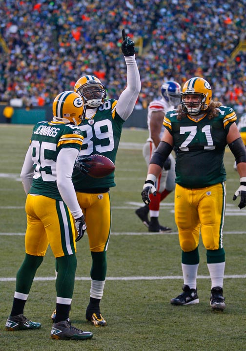 Green Bay Packers wide receiver James Jones points to the sky after scoring a touchdown against the New York Giants while teammates Greg Jennings (85) and Josh Sitton (71) watch.