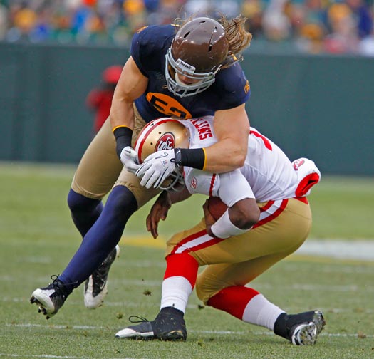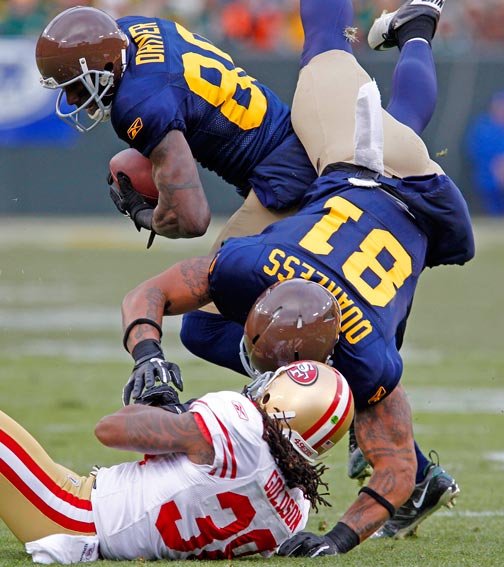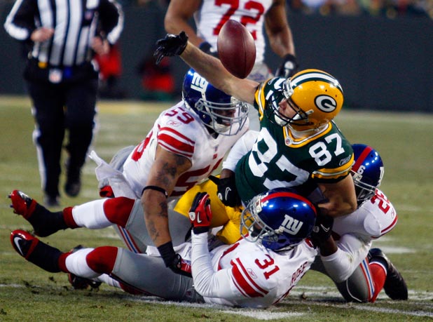 Green Bay Packers wide receiver Jordy Nelson fumbles the ball after getting hit by New York Giants linebacker Michael Boley (59) safety Antrel Rolle (26) and cornerback Aaron Ross (31).