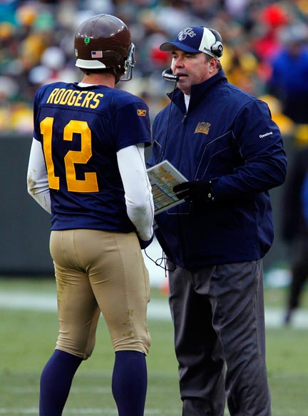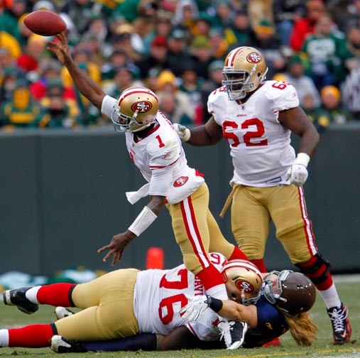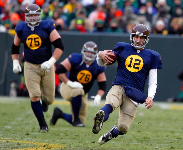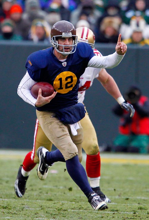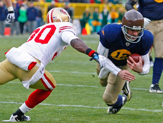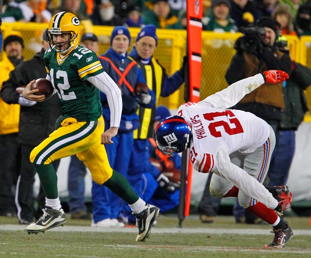 Green Bay Packers quarterback Aaron Rodgers rushes past New York Giants safety Kenny Phillips.