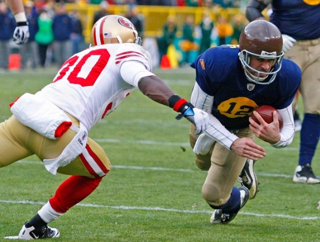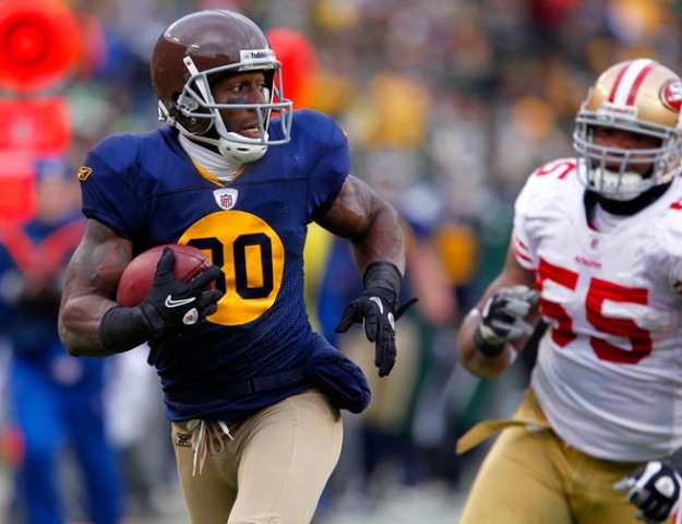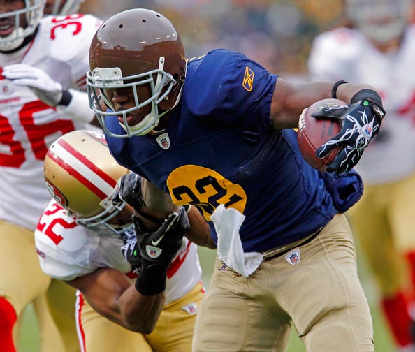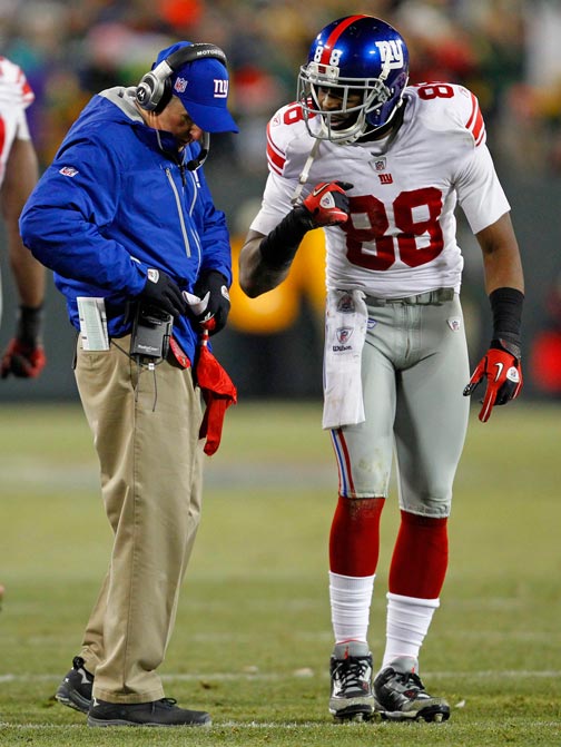 Green Bay Packers wide receiver Greg Jennings makes a move to run past New York Giants cornerback Corey Webster.