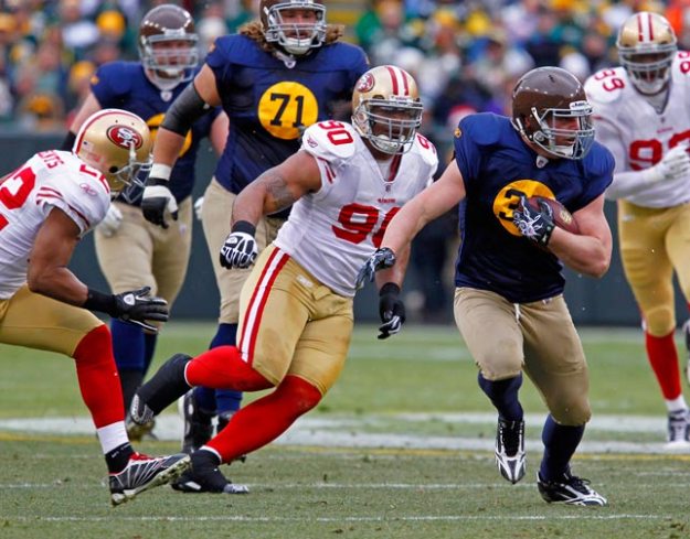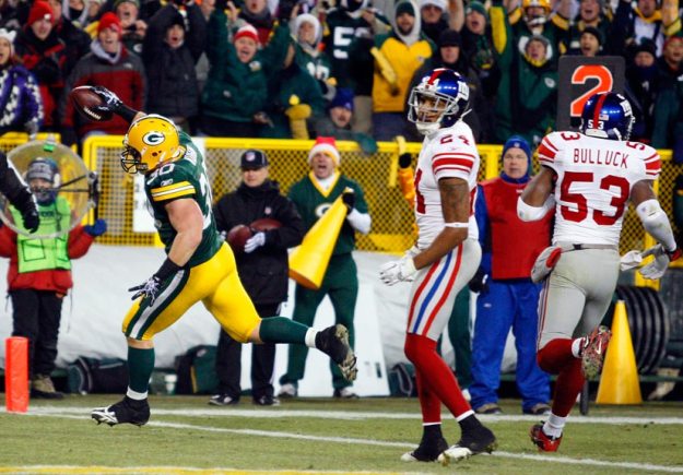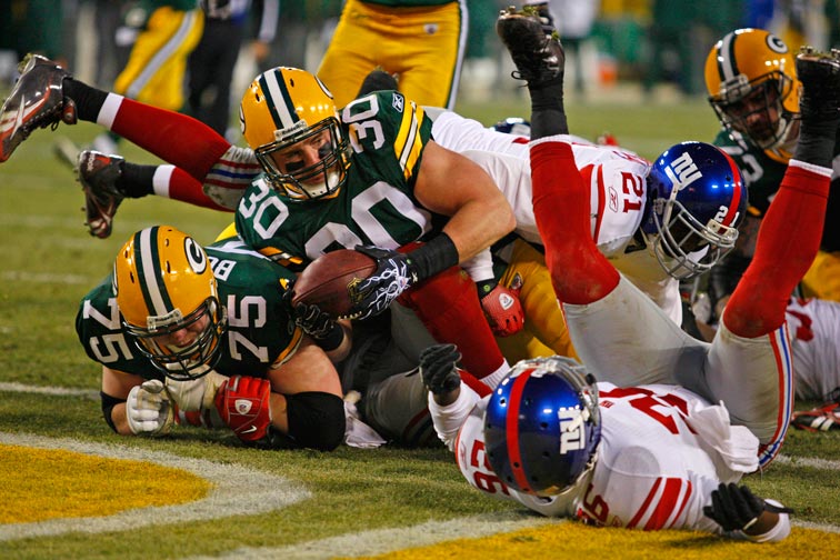 Green Bay Packers fullback John Kuhn scores a touchdown against the New York Giants.