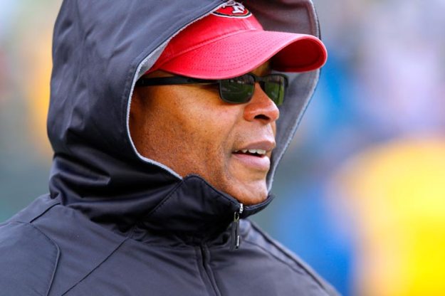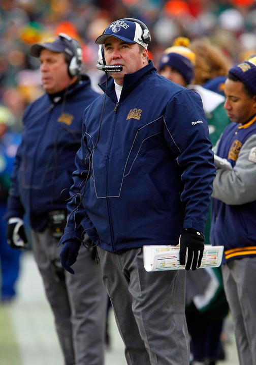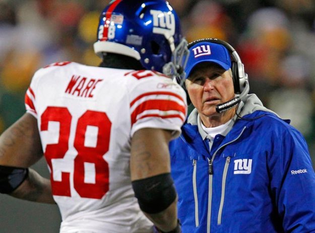New York Giants head coach Tom Coughlin stares down running back Danny Ware after a poor kick return by Ware.