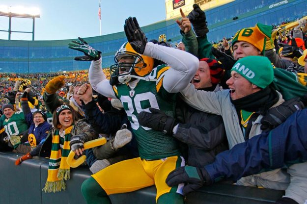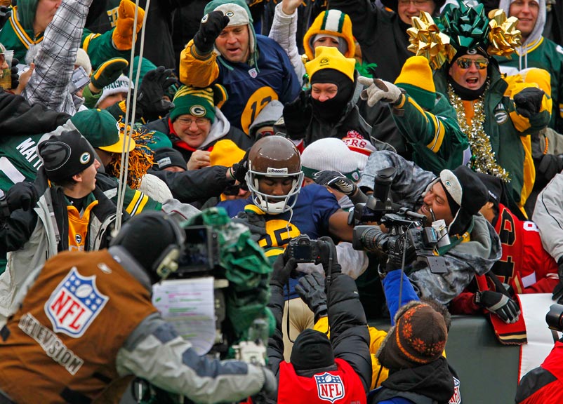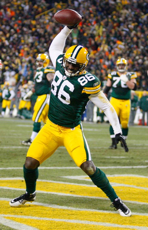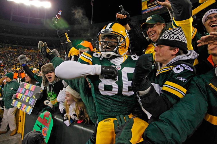 Green Bay Packers wide receiver James Jones celebrates scoring a touchdown against the New York Giants by jumping in the stands.