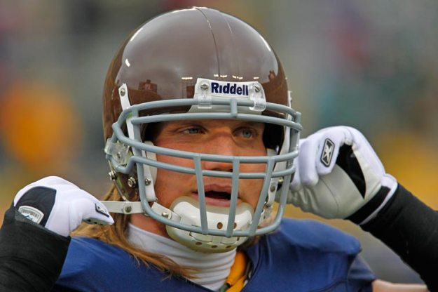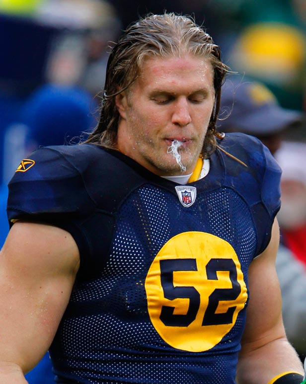 Green Bay Packers tight end Donald Lee celebrates scoring a touchdown against the New York Giants by jumping into the stands.