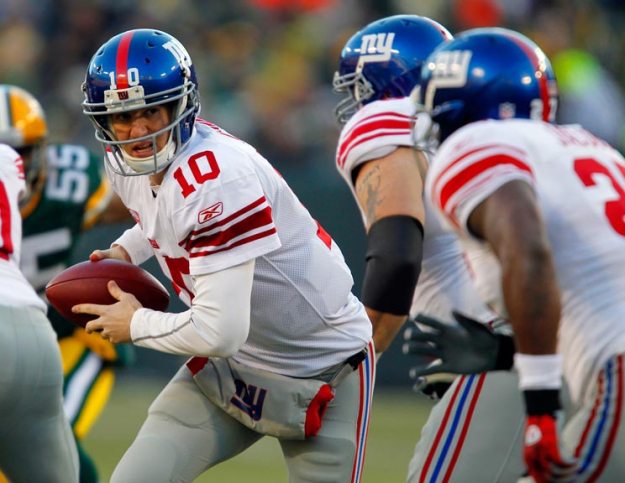 New York Giants quarterback Eli Manning looks to hand the ball off.