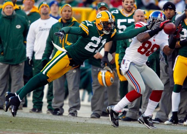 Green Bay Packers cornerback Charles Woodson tries to break up a pass to New York Giants wide receiver Hakeem Nicks.