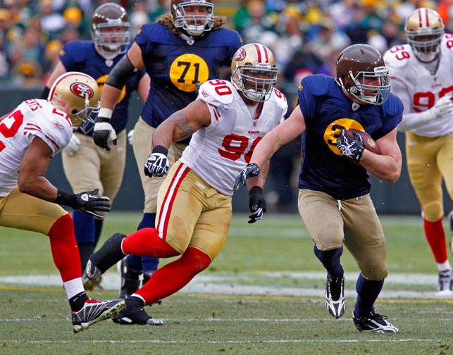 Green Bay Packers fullback John Kuhn scores a touchdown while being pursued by New York Giants linebacker Keith Bulluck (53) and cornerback Terrell Thomas (24).
