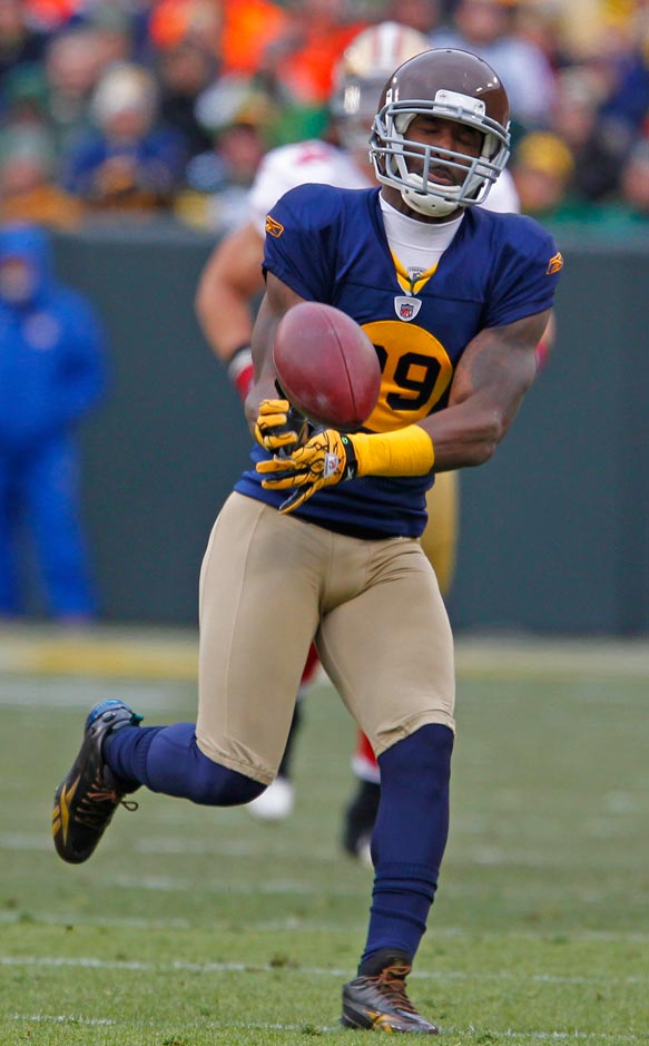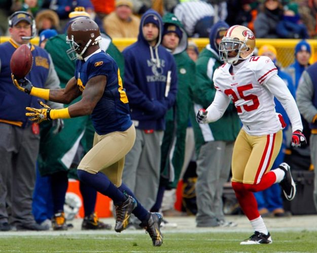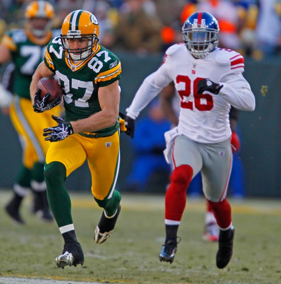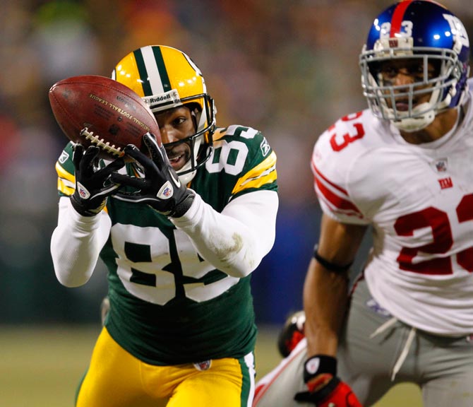 Green Bay Packers wide receiver Greg Jennings makes a fingertip catch while being covered by New York Giants cornerback Corey Webster.