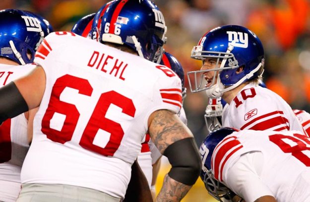 New York Giants quarterback Eli Manning calls a play in the huddle.