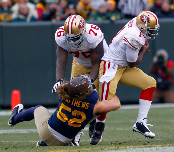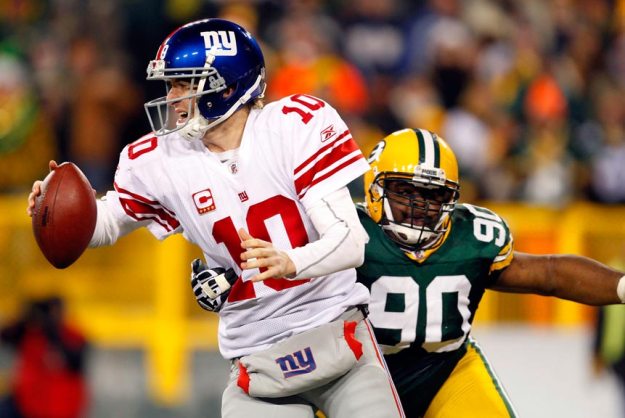 Green Bay Packers defensive tackle B.J. Raji sacks New York Giants quarterback Eli Manning.