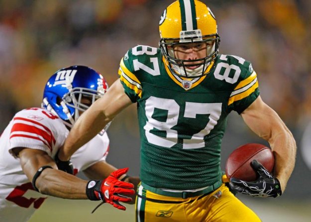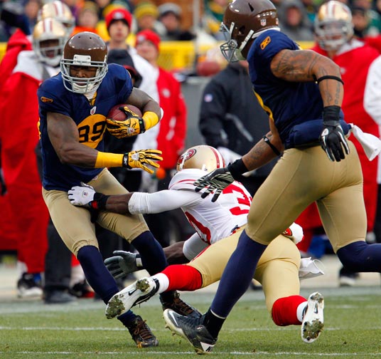 Green Bay Packers wide receiver Jordy Nelson tries to get away from the grasp of New York Giants cornerback Corey Webster.