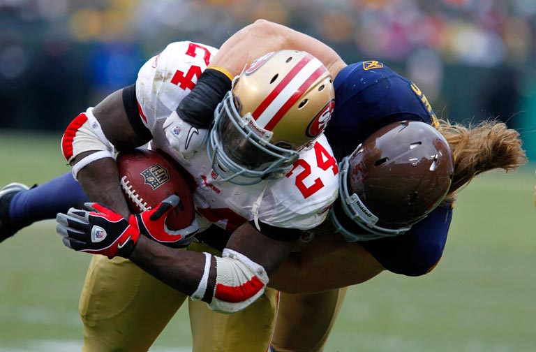 Green Bay Packers running back Dimitri Nance is hit during a run by New York Giants linebacker Keith Bulluck (53) and cornerback Terrell Thomas (24).
