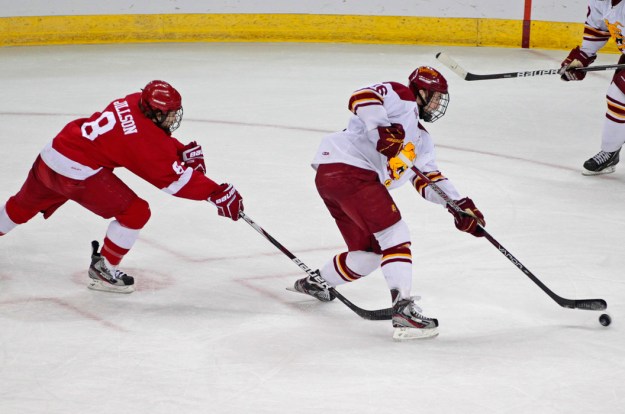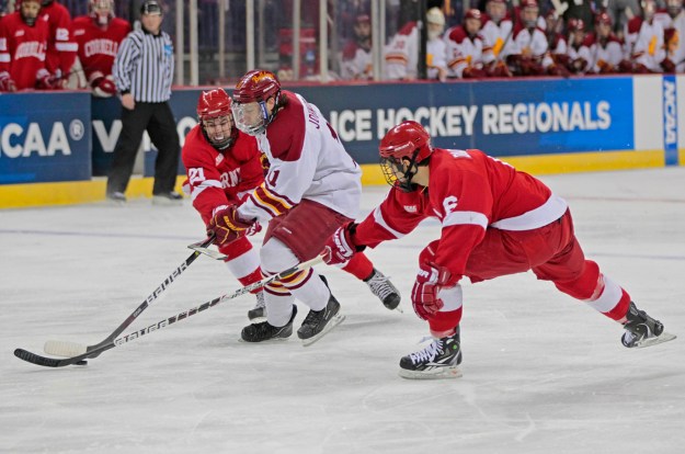 Ferris State’s Jordie Johnston tries to advance the puck past Cornell’s Erik Axell and Nick D’agostino during the first period.