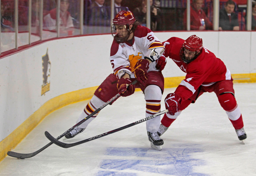 Ferris State’s Aaron Schmit and Cornell’s Keir Ross fight for the puck during the first period.