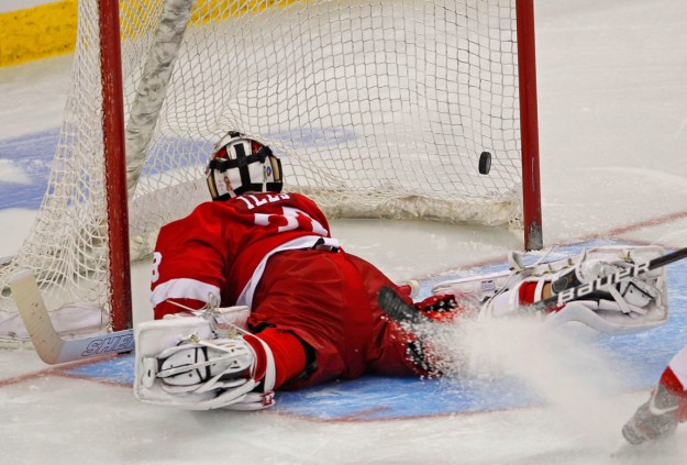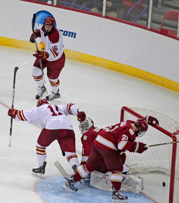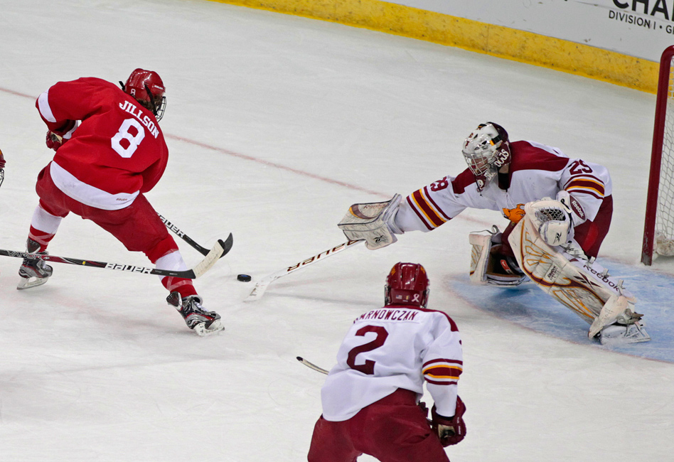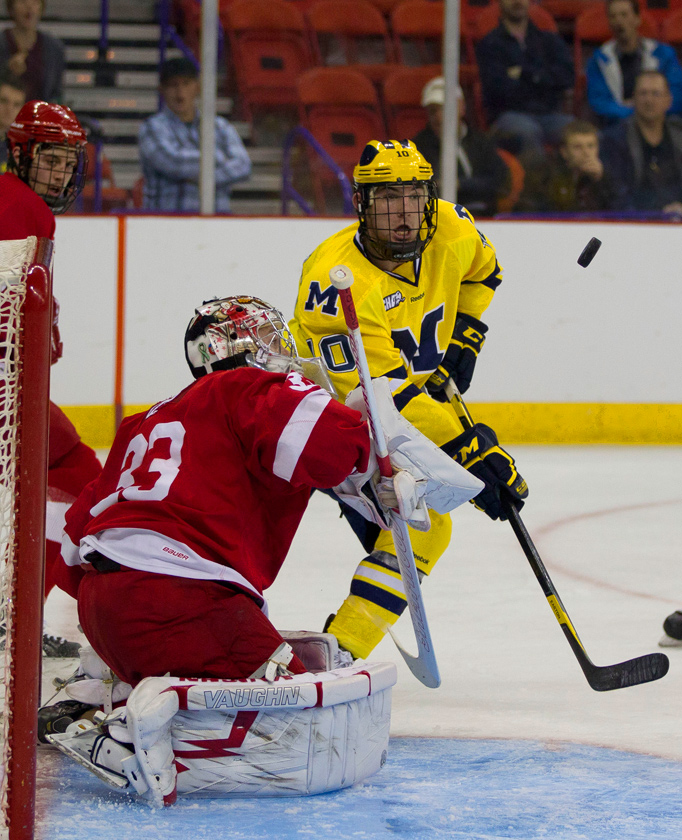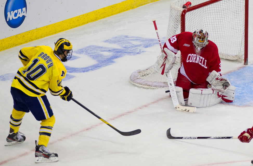 Michigan’s Chris Brown shoots on Cornell’s Goaltender Andy Iles during the second period.