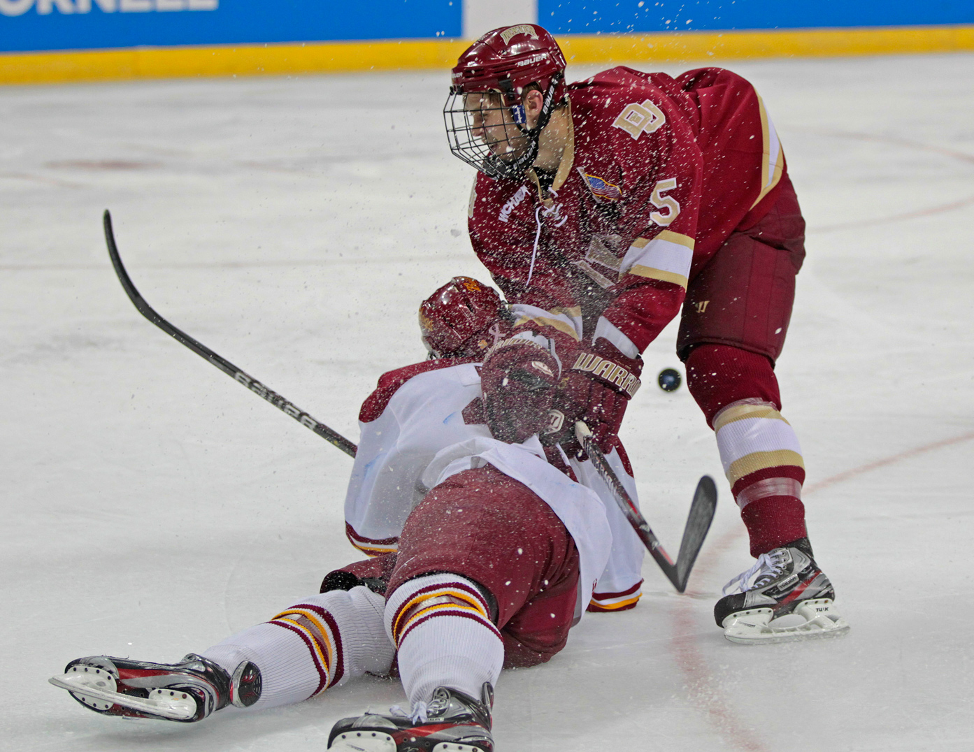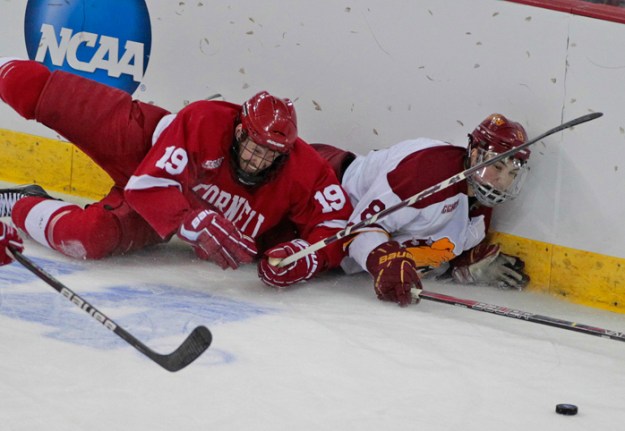 Ferris State’s Cory Kane and Cornell’s Sean Whitney get caught up along the boards while going for the puck during the second period.