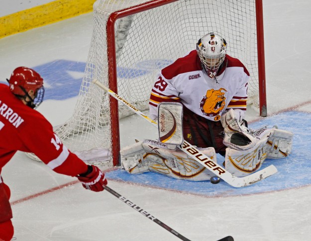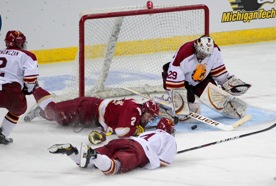Ferris State’s Goaltender Taylor Nelson makes a save against Denver’s Jason Zucker during the second period.